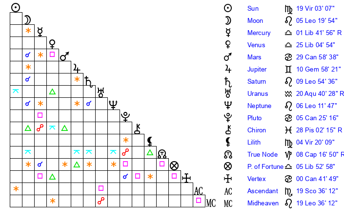 | Neptune | 6 Leo 12 | 1 Aries 3 | 6 Leo 28 |