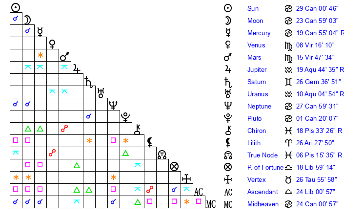 | Moon | 24 Cancer 2 | 2 Cancer 37 | 14 Leo 6 |