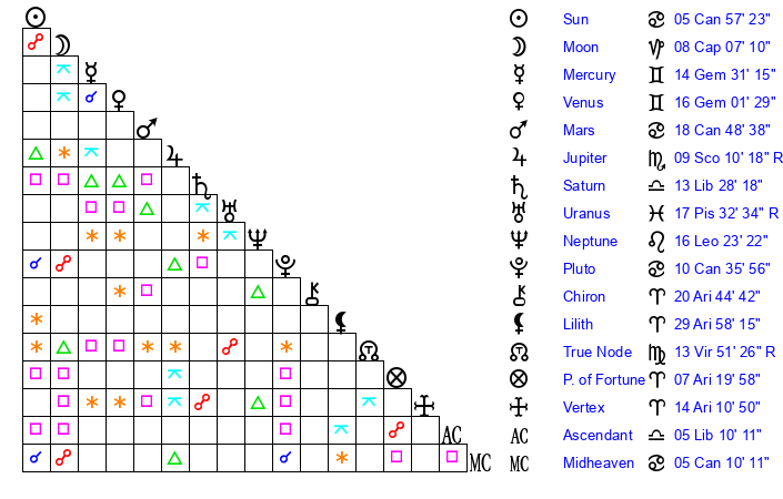 | Pluto | 10 Cancer 36 | 3 Aquarius 10 | 12 Cancer 22 |
