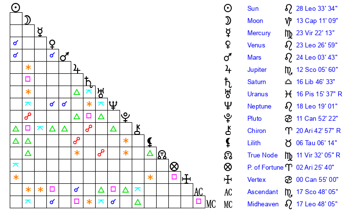 | Neptune | 18 Leo 19 | 1 Aries 34 | 20 Leo 21 |