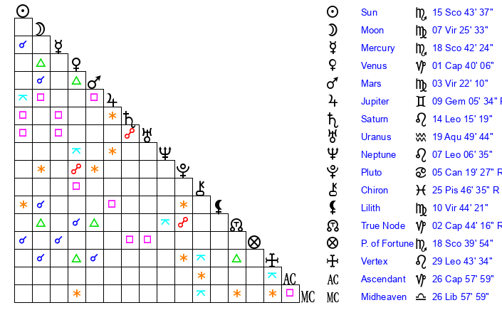 | Sun | 15 Scorpio 43 | 16 Scorpio 32 | 5 Pisces 17 |