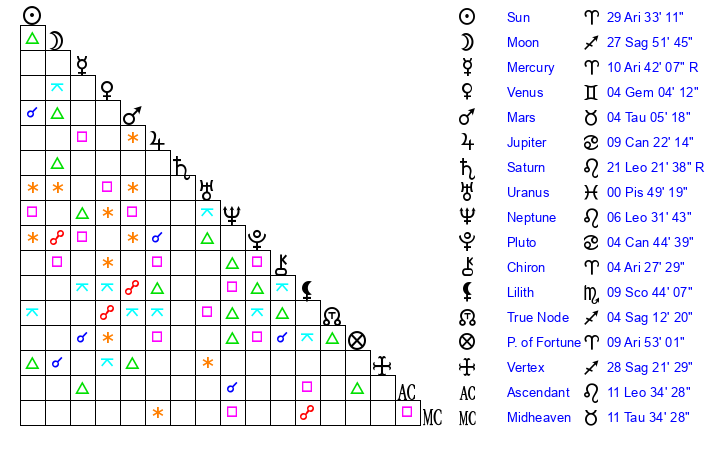 | Sun | 29 Aries 33 | 0 Taurus 52 | 11 Leo 14 |
