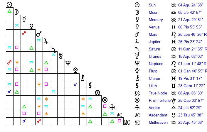 | Sun | 4 Aquarius 25 | 5 Aquarius 59 | 22 Taurus 34 |