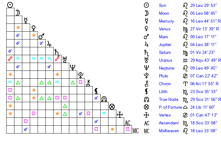 | Sun | 29 Leo 29 | 0 Virgo 49 | 14 Sagittarius 33 |