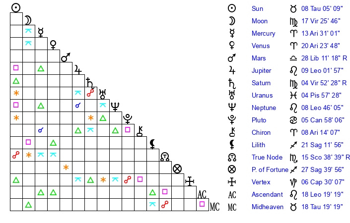 | Moon | 17 Virgo 26 | 21 Taurus 28 | 14 Cancer 39 |