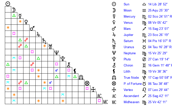| Neptune | 15 Virgo 25 | 0 Aries 20 | 16 Virgo 40 |