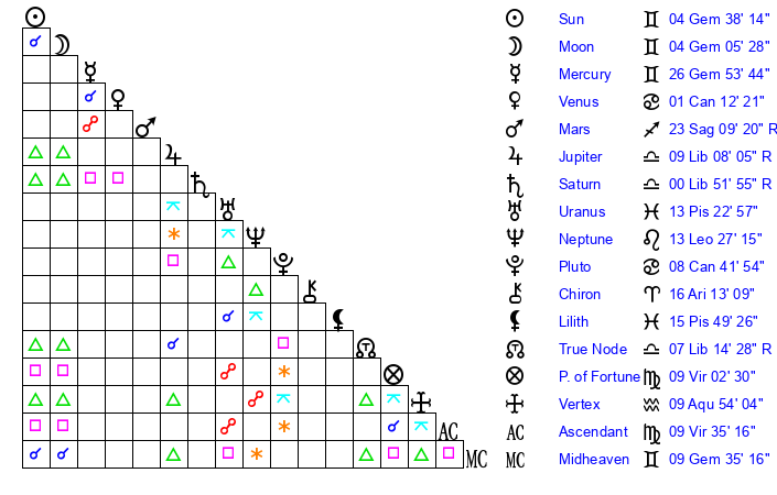 | Sun | 4 Gemini 38 | 5 Gemini 42 | 13 Virgo 18 |