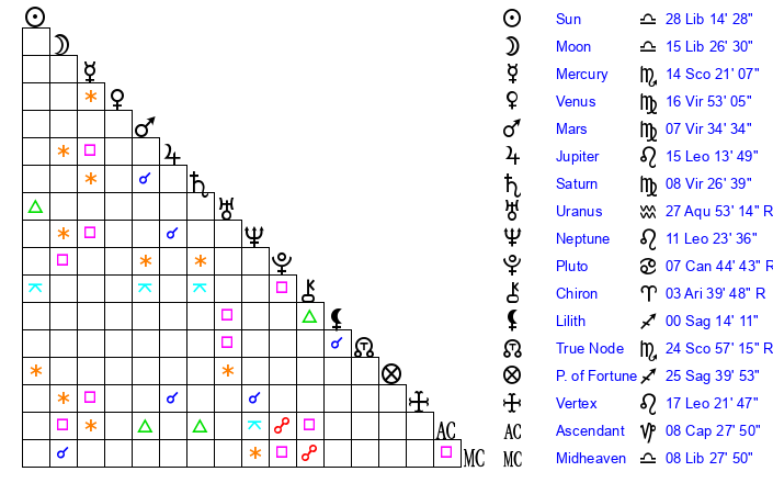 | Sun | 28 Libra 14 | 29 Libra 33 | 15 Aquarius 36 |