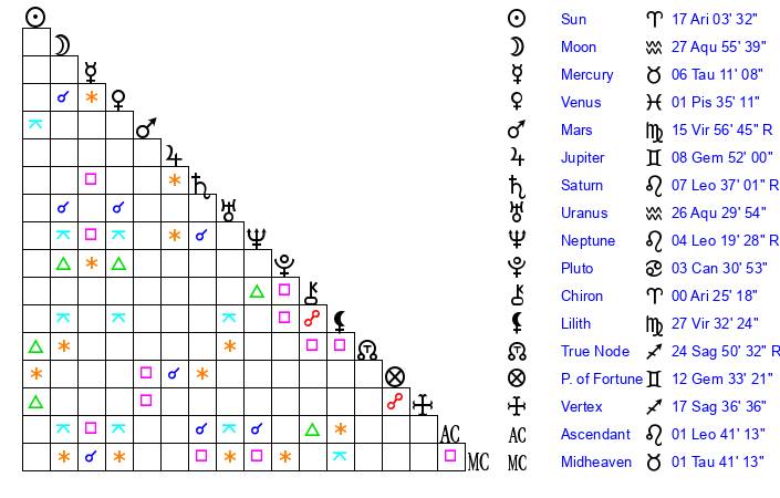| Sun | 17 Aries 3 | 18 Aries 7 | 0 Leo 0 |