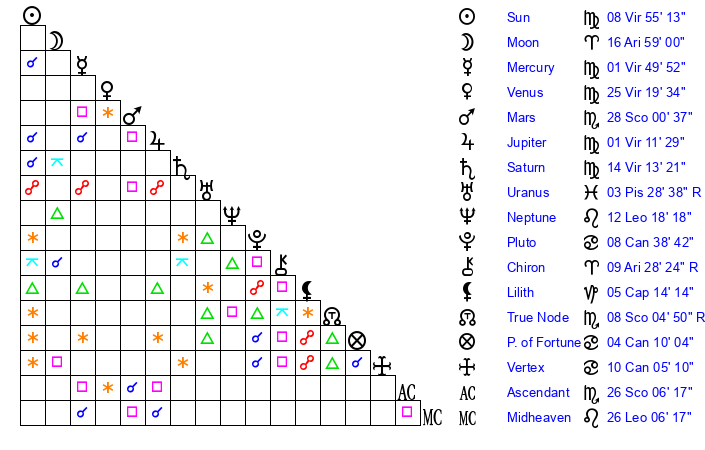 | Moon | 16 Aries 59 | 25 Sagittarius 29 | 21 Aquarius 0 |