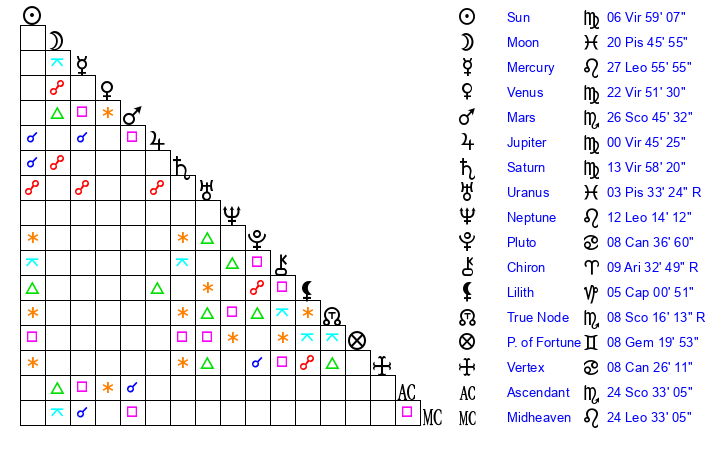 | Saturn | 14 Virgo 36 | 29 Pisces 59 | 25 Virgo 3 |