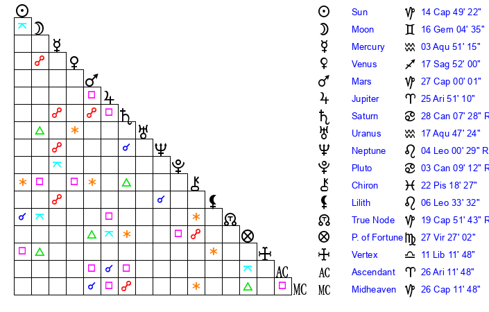 | Mars | 27 Capricorn 0 | 16 Capricorn 18 | 22 Aries 17 |