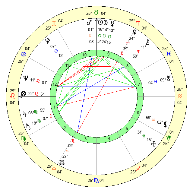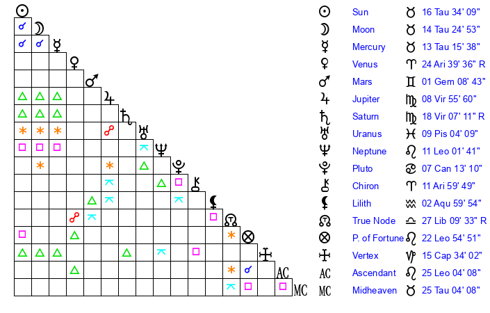 | Moon | 14 Taurus 29 | 22 Virgo 58 | 7 Pisces 51 |