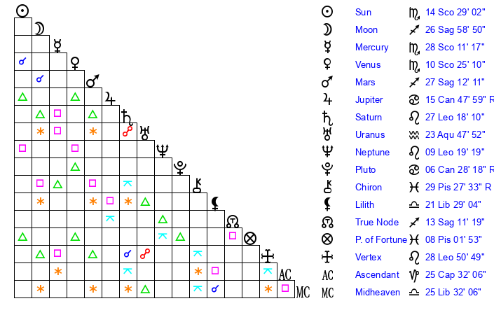 | Sun | 14 Scorpio 29 | 15 Scorpio 32 | 3 Pisces 2 |