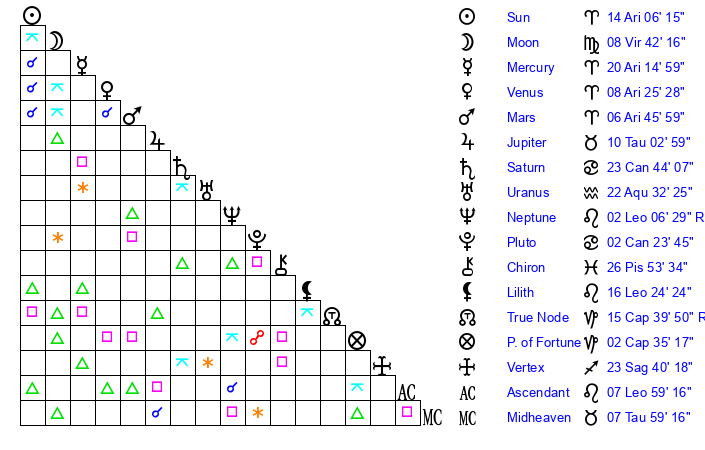 Moon | 8 Virgo 39 | 7 Cancer 2 | 23 Leo 38 |