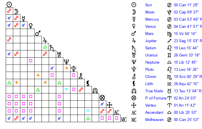 | Mercury | 3 Cancer 54 | 22 Cancer 46 | 4 Libra 38 |