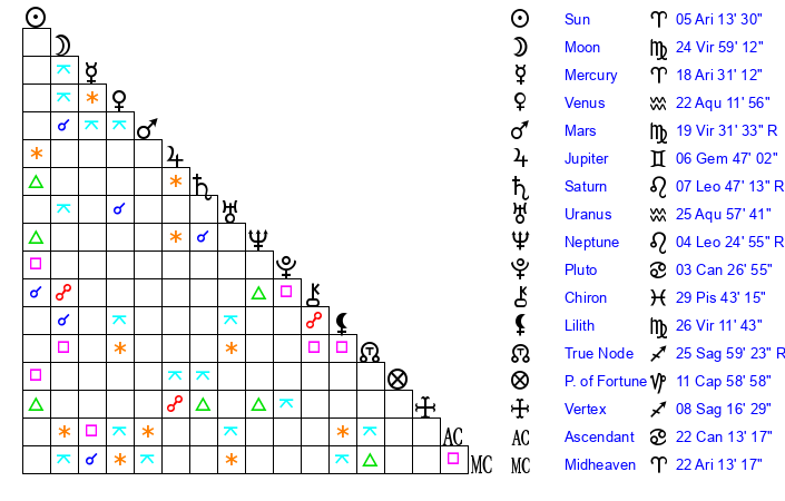 | Moon | 24 Virgo 56 | 28 Aquarius 29 | 28 Leo 12 |