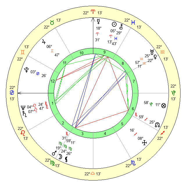 | Sun | 5 Aries 13 | 6 Aries 17 | 18 Cancer 33 |