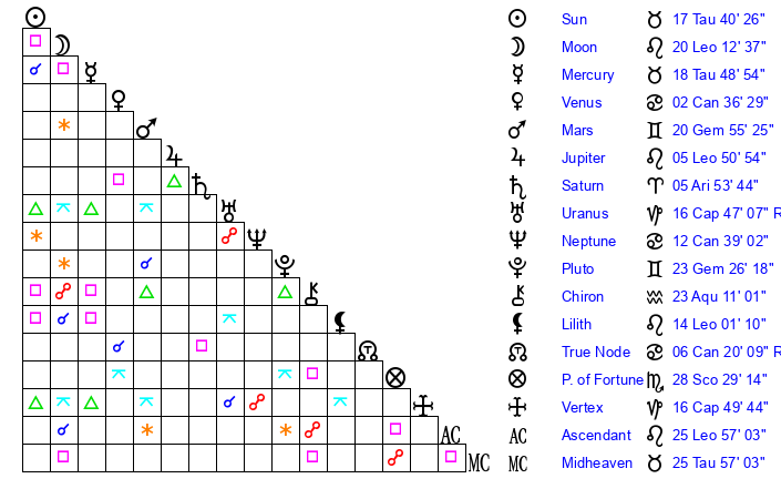 | Mercury | 18 Taurus 50 | 27 Aries 2 | 21 Virgo 32 |