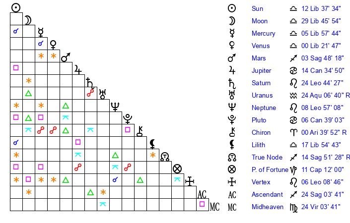 | Sun | 12 Libra 37 | 13 Libra 41 | 0 Aquarius 37 |