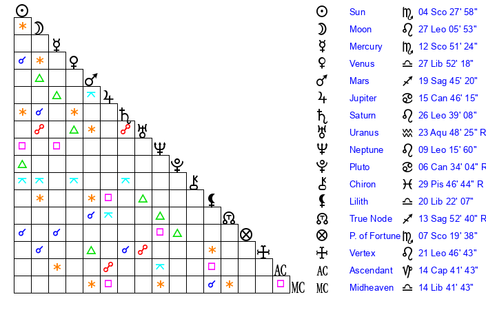 | Neptune | 9 Leo 16 | 29 Pisces 51 | 7 Leo 31 |