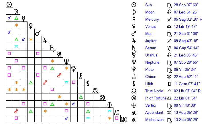 | Sun | 28 Scorpio 38 | 29 Scorpio 38 | 5 Aquarius 45 |
