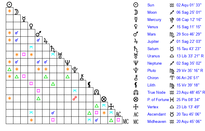 | Neptune | 2 Sagittarius 34 | 27 Pisces 43 | 3 Sagittarius 1 |