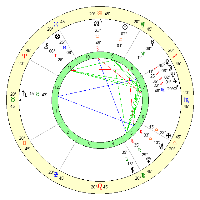 | Moon | 6 Sagittarius 20 | 12 Scorpio 2 | 28 Scorpio 9 |