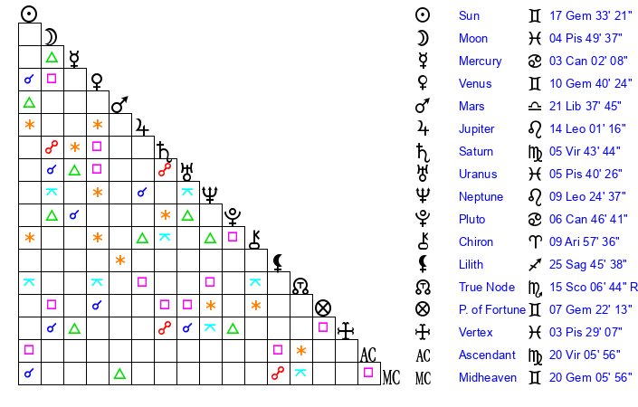 | Sun | 17 Gemini 33 | 18 Gemini 9 | 28 Virgo 23 |