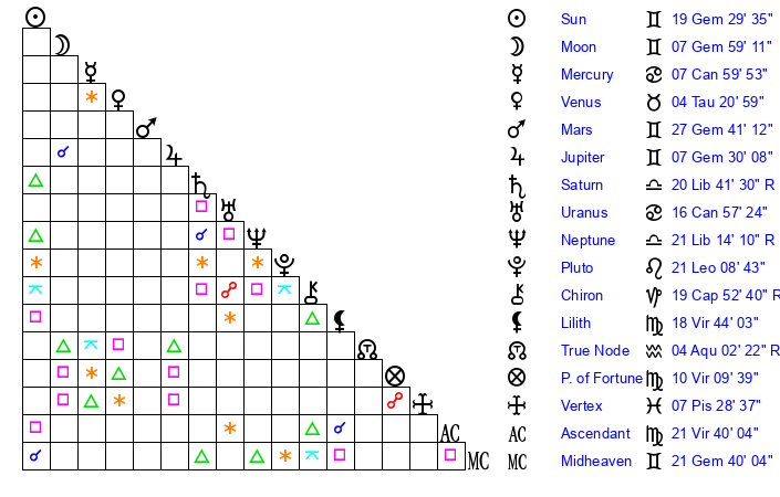 | Sun | 19 Gemini 29 | 20 Gemini 4 | 28 Leo 19 |