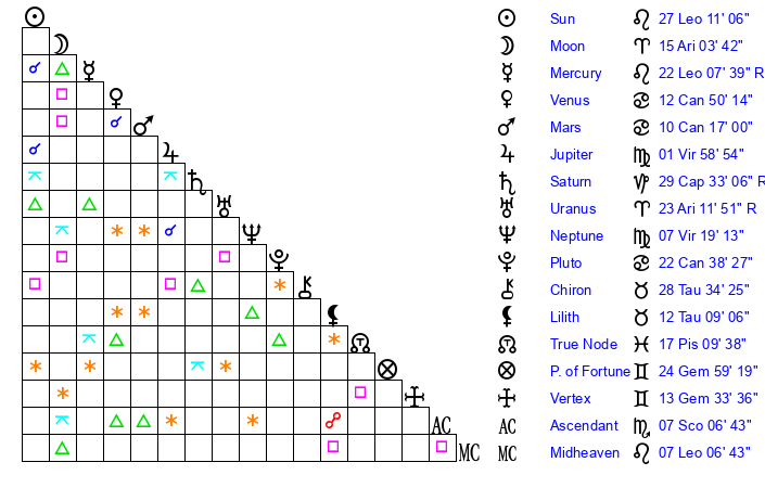 | Mercury | 22 Leo 7 | 9 Leo 10 | 19 Sagittarius 48 |