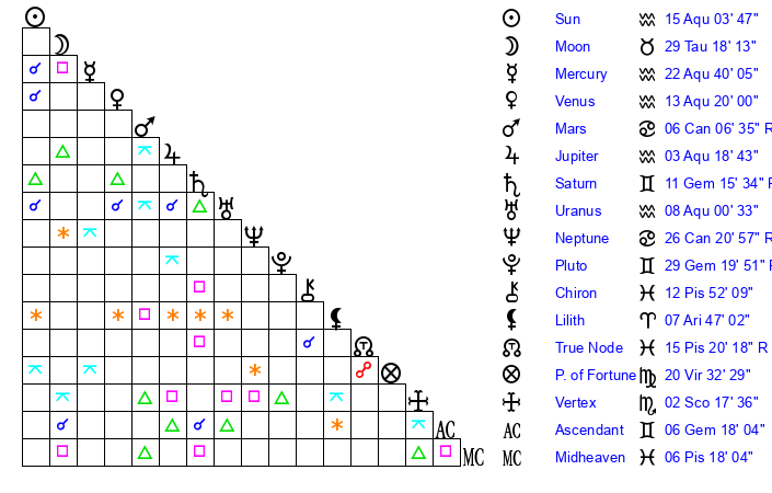| Sun | 15 Aquarius 3 | 16 Aquarius 8 | 4 Gemini 35 |