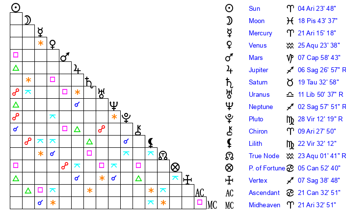 | Mars | 7 Capricorn 58 | 21 Cancer 40 | 7 Aquarius 18 |