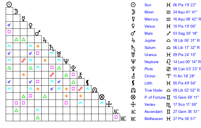 | Moon | 24 Aquarius 37 | 6 Aquarius 26 | 4 Sagittarius 56 |