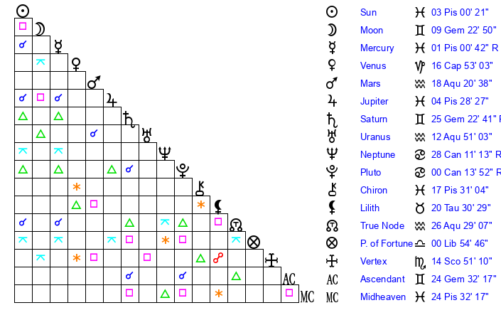 | Sun | 3 Pisces 0 | 4 Pisces 19 | 20 Gemini 37 |