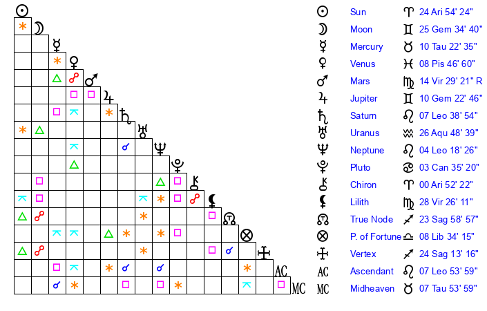| Sun | 24 Aries 54 | 25 Aries 58 | 7 Leo 38 |