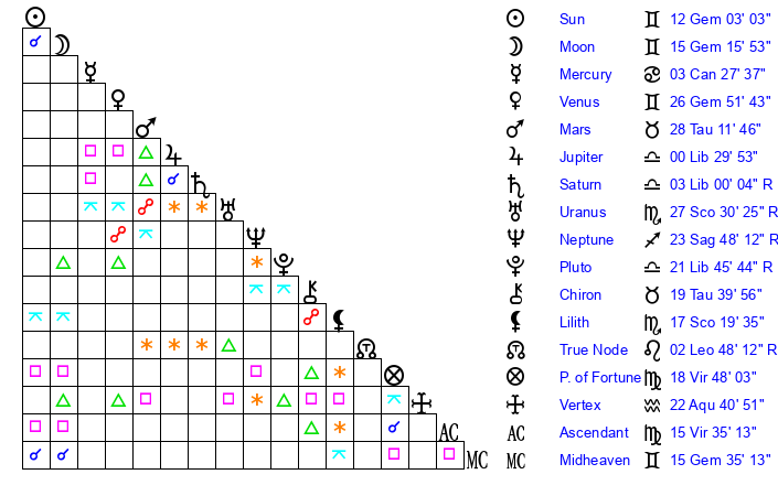 Jupiter | 0 Libra 20 | 28 Gemini 23 | 3 Libra 46 |