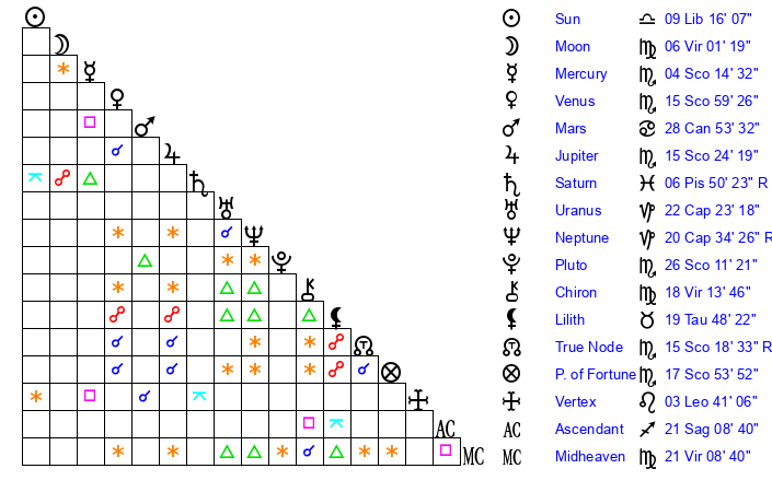 Moon | 5 Virgo 56 | 11 Aquarius 25 | 27 Libra 50 |