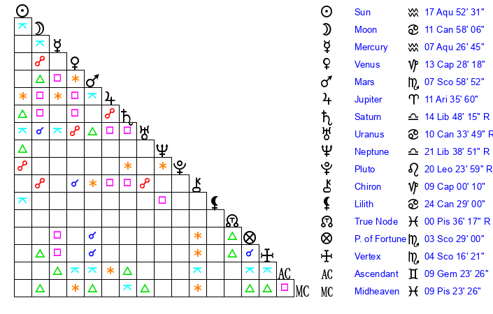 | Moon | 11 Cancer 56 | 19 Gemini 48 | 14 Pisces 18 |