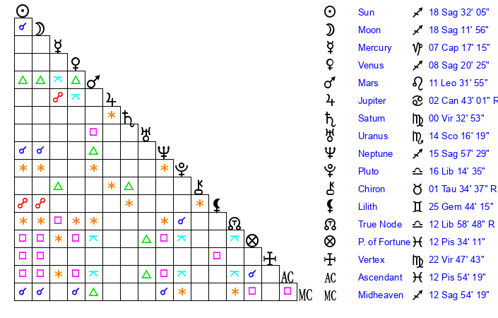 | Moon | 18 Sagittarius 10 | 5 Virgo 12 | 15 Virgo 40 |