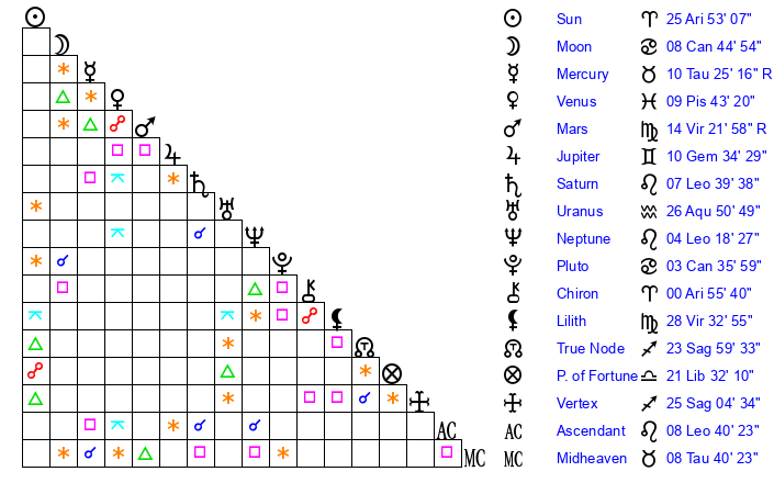 | Sun | 25 Aries 53 | 26 Aries 57 | 8 Leo 36 |