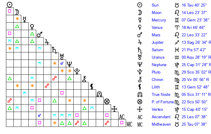 Venus | 18 Aries 46 | 4 Aries 23 | 25 Taurus 10 |