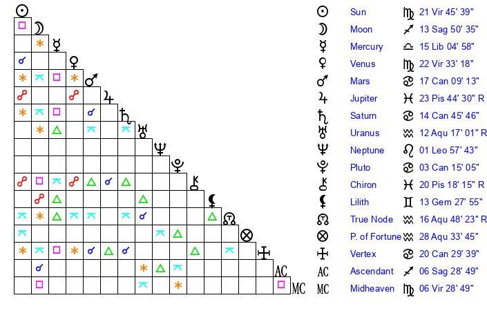 | Sun | 21 Virgo 45 | 23 Virgo 6 | 12 Capricorn 0 |