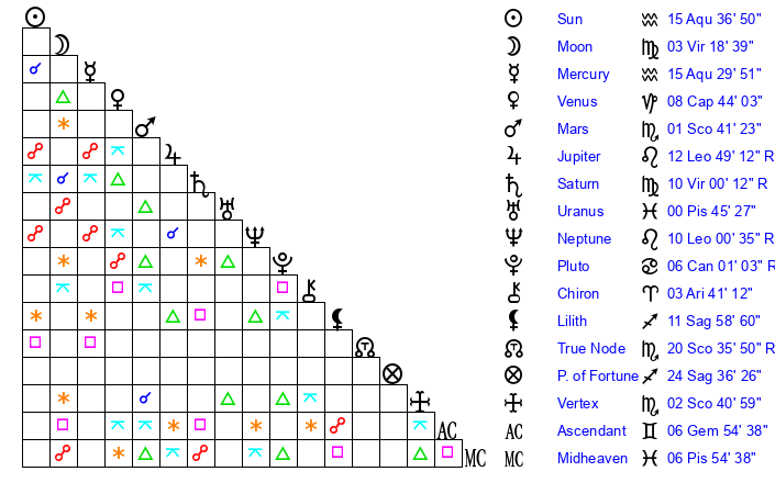 | Saturn | 10 Virgo 46 | 17 Pisces 52 | 5 Virgo 41 |