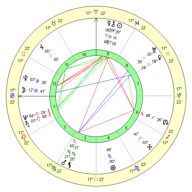 | Moon | 12 Cancer 43 | 10 Sagittarius 10 | 9 Gemini 37 |