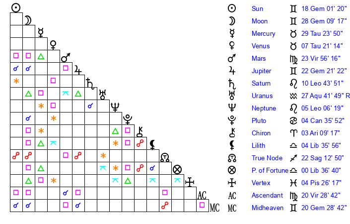 | Moon | 28 Gemini 5 | 1 Sagittarius 2 | 28 Taurus 55 |