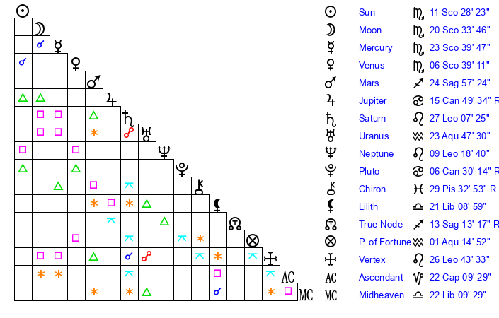 | Moon | 20 Scorpio 40 | 0 Taurus 27 | 23 Libra 29 |