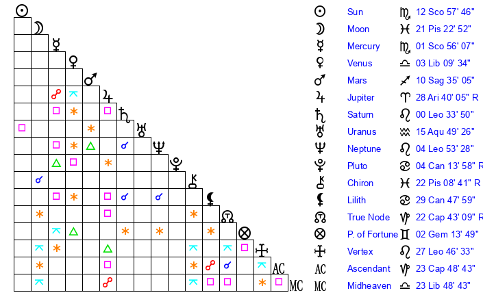 | Sun | 12 Scorpio 57 | 13 Scorpio 32 | 3 Pisces 31 |