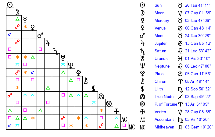 | Sun | 26 Taurus 41 | 28 Taurus 0 | 8 Virgo 11 |