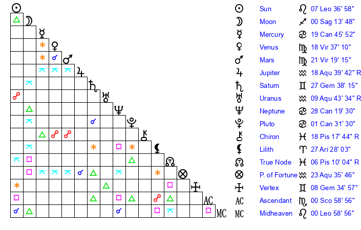 | Moon | 0 Sagittarius 14 | 29 Libra 51 | 25 Sagittarius 10 |